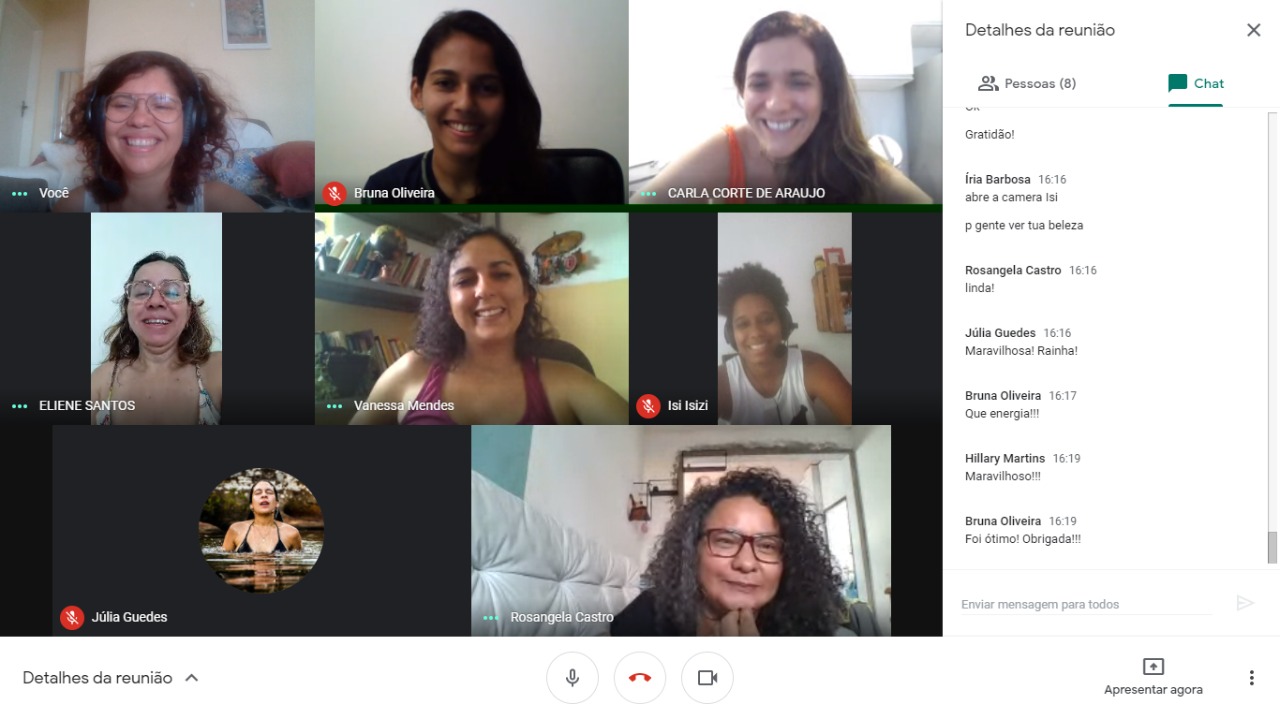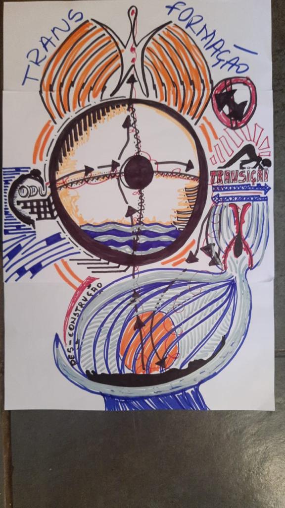 A primeira oficina do projeto Feminino Incorpóreo foi um encontro-convite às mulheres-peixes-pássaros, especialmente do Ifba de Jacobina, para um mergulho interior onde a construção da auto imagem fosse caminho/processo para criação de si mesma como corpo-pessoa e corpo-coletivo. A vivência artística contou com uma tarde de imersão em processos criativos. Assim, a partir de cinco Odus (caminhos) trilhamos a nossa experiência, sendo eles o Odu de Origem, Odu de Transição, Odu de Desconstrução, Odu de Transformação e Odu de Encantamento. Quando o fantasma colonial é um pesadelo, olharmo-nos, a si e às vizinhas, pode ser fonte de encantamento e oportunidade para confabular sonhos e imaginar imagens.